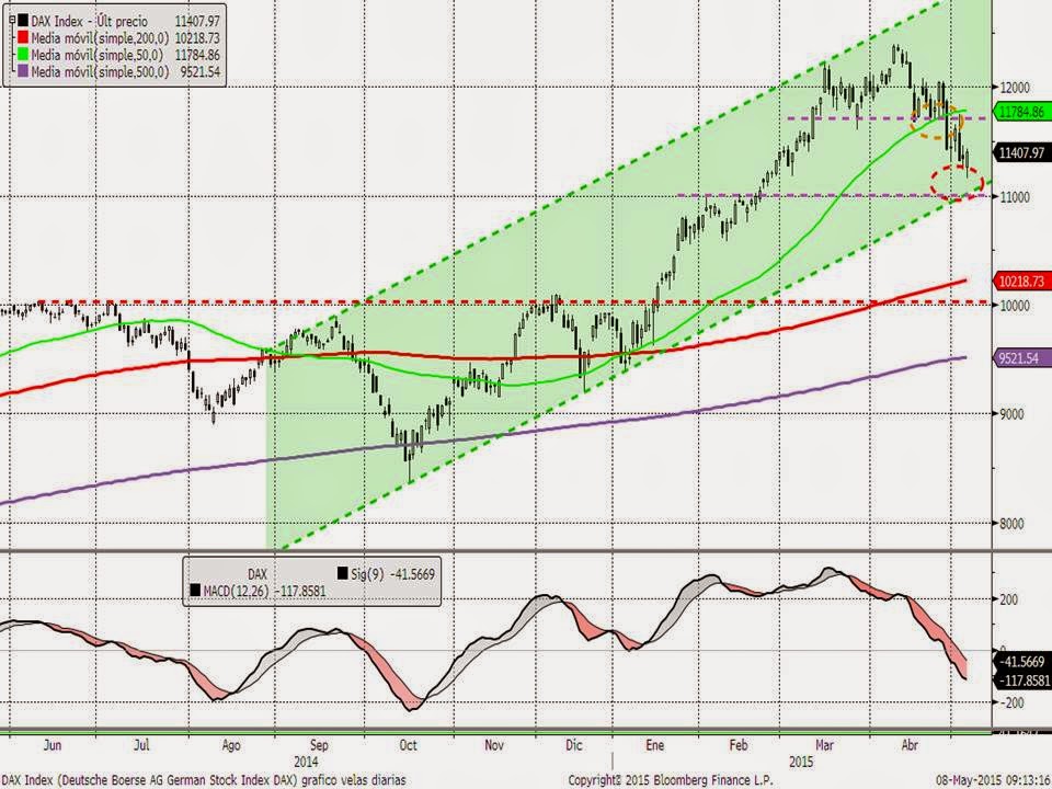 Así pues, tras las caídas desde mediados de marzo, el movimiento más probable es que las bolsas entren en un movimiento lateral entre las zonas de soporte perdido la semana pasada y los soportes de corto plazo que se han podido marcar esta semana. Sería el Ibex entre 10.700 y 11.300, el Eurostoxx 600 entre 375 y 400 puntos y el DAX entre 11.000 y 11.700 puntos tal y como se aprecia en el siguiente gráfico.