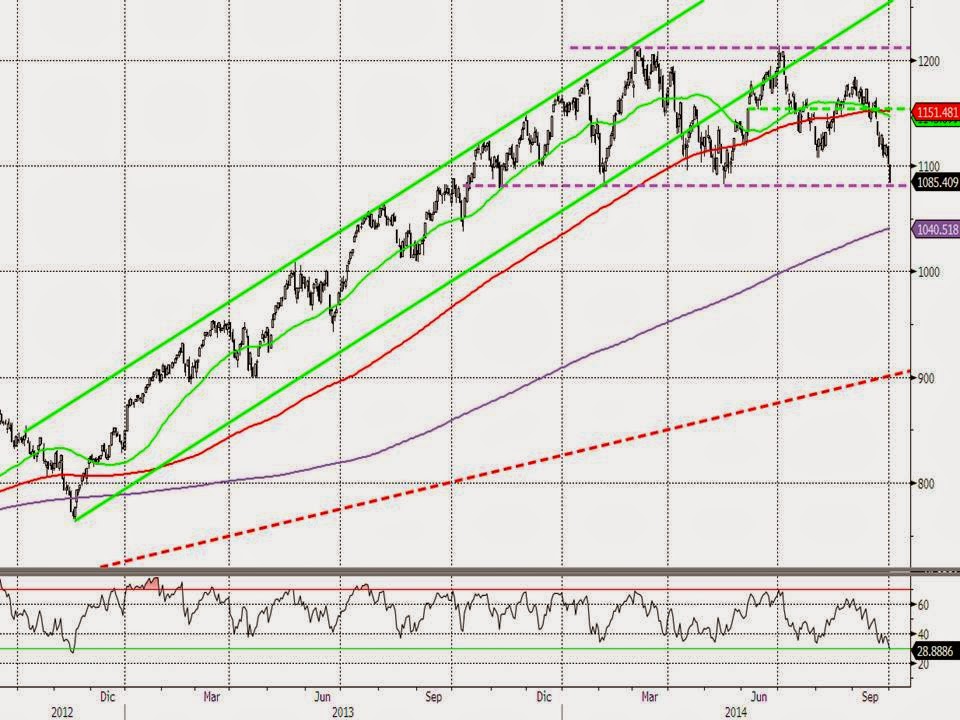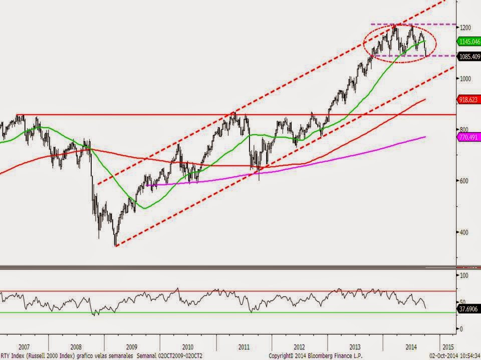 El RSI está en niveles de sobreventa y la zona es de claro soporte, pero insistimos que un cierre por debajo del nivel de 1075, sobre todo en cierre semanal sería crítico para este índice y provocaría confirmación del techo en la zona de 1.200 puntos ya que significaría perder el canal lateral del último año y los inversores buscarían el siguiente soporte que no es otro que la zona de 1.000 puntos, que es la base del canal alcista iniciado en el año 2009, según se aprecia en el gráfico de velas semanales.