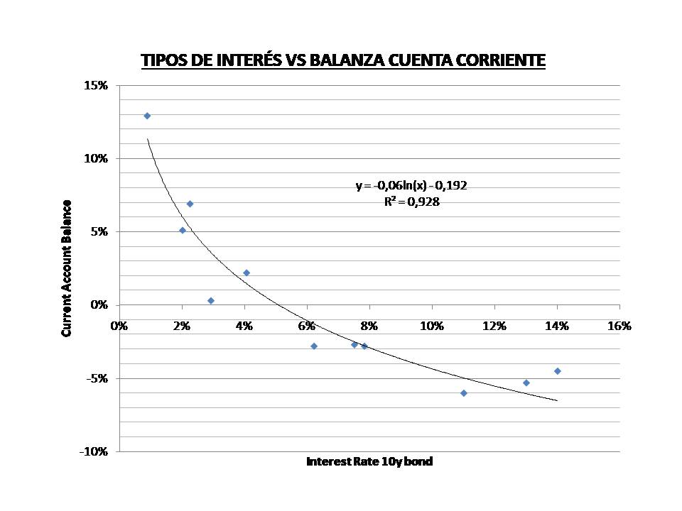 Figura.- Análisis de correlación del saldo por cuenta corriente como porcentaje del PIB y los tipos de interés de los bonos a 10 años. Elaboración propia a partir de datos The Economist.