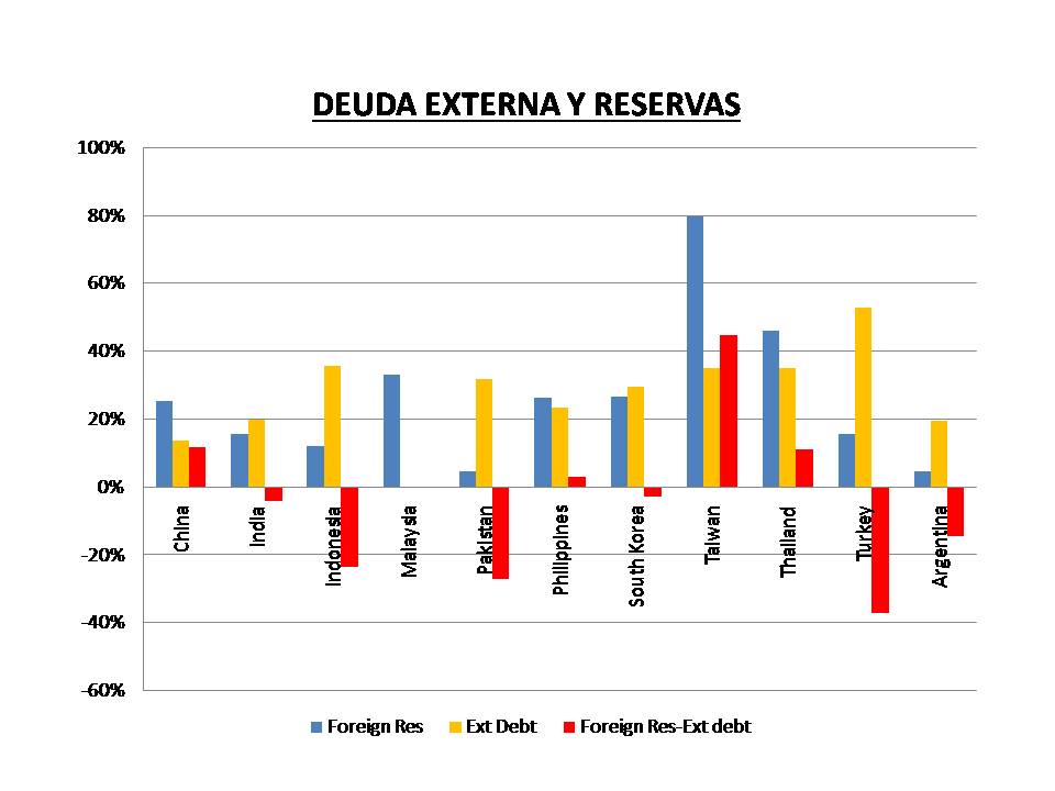 Como se puede apreciar en la figura, seis países presentan una deuda externa superior a sus reservas, pero mientras que en India y Corea del Sur estas diferencias son mínimas, en Turquía y Argentina llegan a suponer respectivamente el 37,3% y 14,8% del PIB, encontrándose entre ellos Indonesia y Pakistan.
