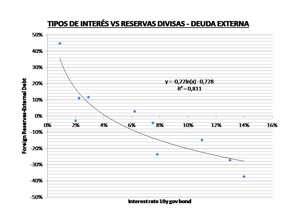 Figura.- Análisis de correlación del saldo reservas en divisas – deuda exterior como porcentaje del PIB y los tipos de interés de los bonos a 10 años. Elaboración propia a partir de datos de Tradingeconomics y The Economist.
