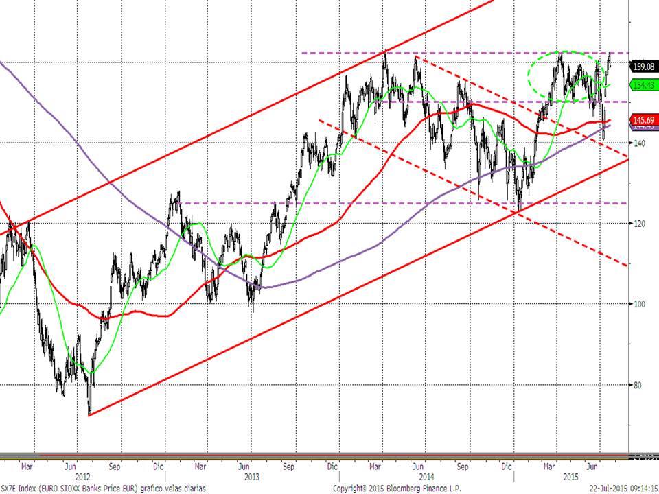 Y si en Estados Unidos son los resultados empresariales los que deberían generar la posibilidad de una ruptura de los máximos del año, en Europa reiteramos que es el comportamiento del sectorial bancario. En el gráfico del sectorial bancario del Eurostoxx se aprecia, que al igual que en el S&P500, la zona de máximos del año (que además son los máximos del año pasado) funcionó ayer de nuevo como resistencia. Hasta que no supere este índice estos máximos, será muy complicado que los índices europeos mantengan las subidas de forma sostenible.