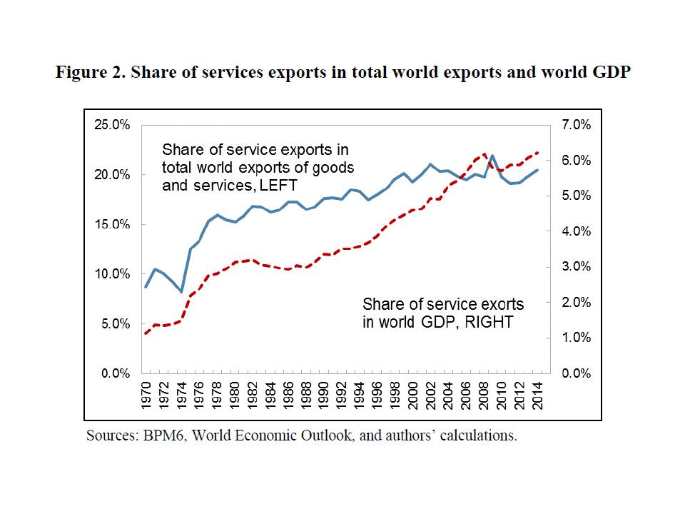Las exportaciones de servicios cada vez cobran más importancia en las economías, observándose un importante crecimiento, tanto de su cuota sobre las exportaciones totales como de su importancia en el PIB global, traduciéndose este hecho en que, entre 1970 y 2014, la cuota de exportaciones de servicios se haya más que doblado llegando al 20% y su contribución al PIB global se haya sextuplicado llegando al 6% (figura siguiente).