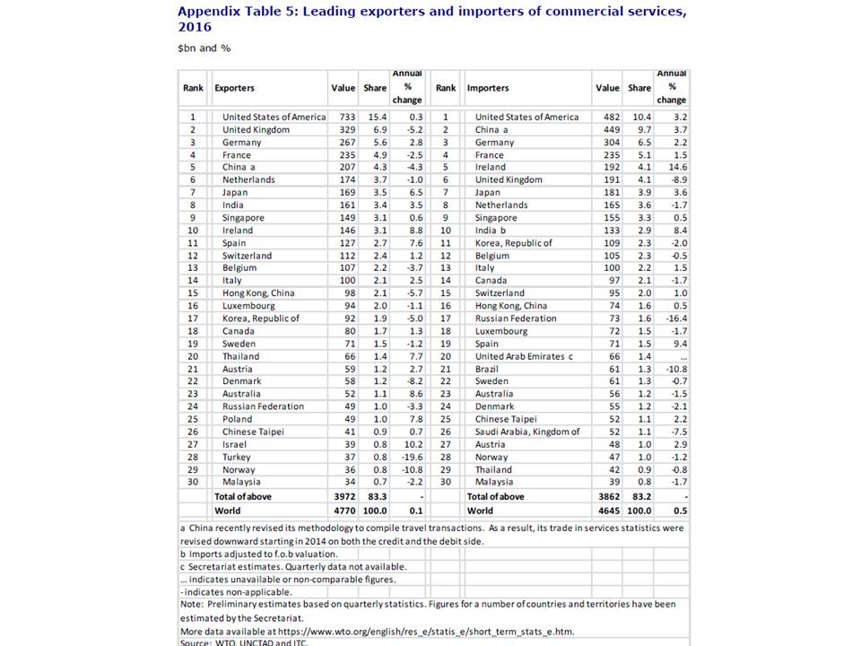 En lo que respecta a España, ocupa una posición destacada en el ranking de países exportadores de servicios, ocupando la onceava posición con una cuota mundial del 2,7% , jugando en este caso un papel importante el liderazgo que España presenta en el sector turístico, ya que es la tercera potencia mundial y ocupa el primer puesto en el ranking de competitividad del “Travel &Tourism Competitiveness Report 2017” del World Economic Forum.