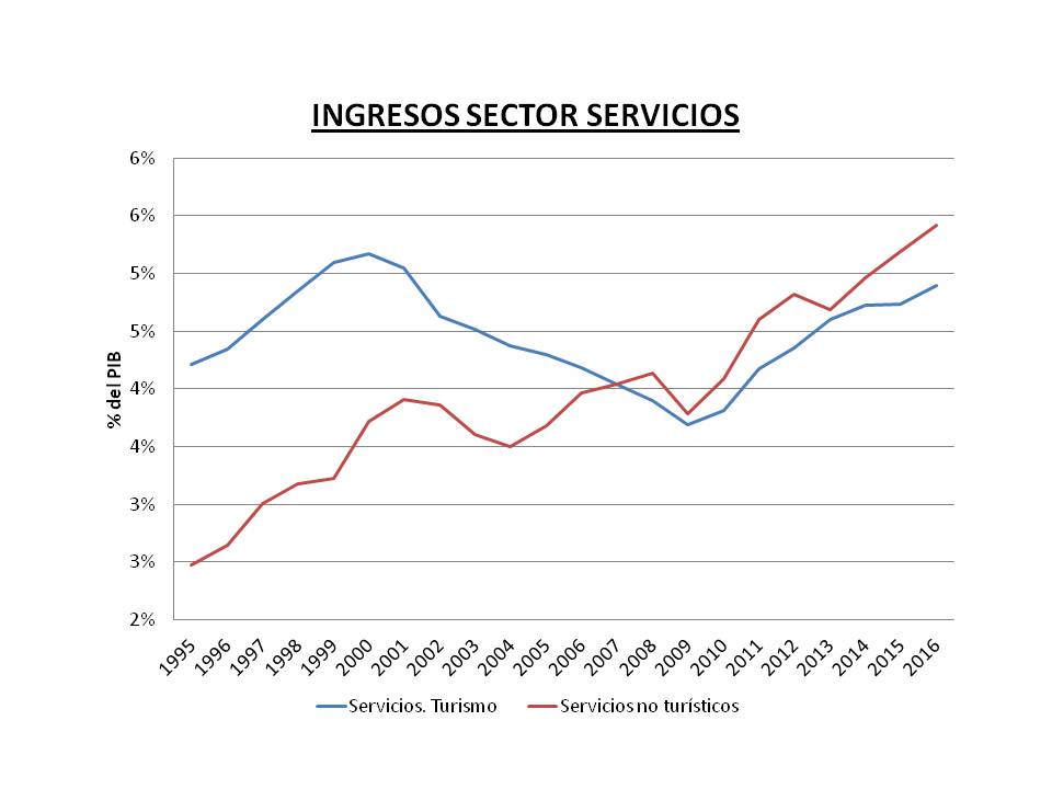 En cuanto a la evolución del sector servicios, es de destacar que a partir del año 2007 los ingresos por servicios no turísticos sobrepasaron a los turísticos (figura siguiente), representando en el año 2016 los ingresos por los primeros el 5,41% del PIB frente al 4,89% que suponía el turismo.