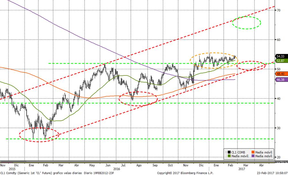 Los últimos datos confirman que sí que los miembros de la OPEP están cumpliendo su compromiso de reducir la producción, por lo que no es descartable que se produzca la ruptura alcista del petróleo y continúe la tendencia alcista previa dentro del canal iniciado en febrero del año pasado. Si esto se produjese, sería positivo para los activos de riesgo, sobre todo emergentes, y negativo para la renta fija puesto que continuaría el repunte de la inflación actual, y tanto la FED como el BCE retirarían estímulos monetarios, más rápido de lo que descuenta ahora el mercado.