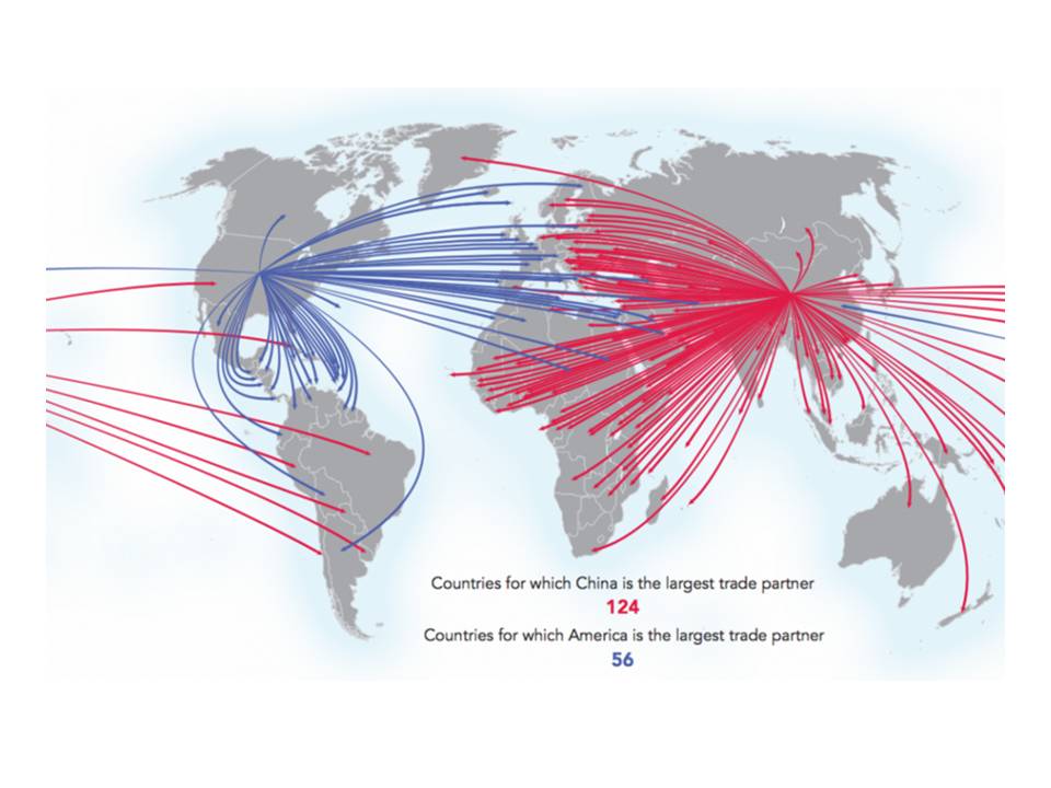 En este sentido, merece la pena destacar que aunque el volumen comercial global estadounidense es superior en dólares al chino (5 billones de dólares con respecto a 4,78 billones), China es el principal socio comercial de 124 países, mientras que U.S. lo es de solo 56 . Aunque las zonas de influencia son distintas, ya que el comercio chino se lleva a cabo preferentemente con países de Asia, Europa Oriental, África y Australia, mientras que la esfera de influencia estadounidense abarca Europa y Norte y Sur América, por lo que sus esferas de relaciones comerciales difieren en gran medida (figura siguiente).
