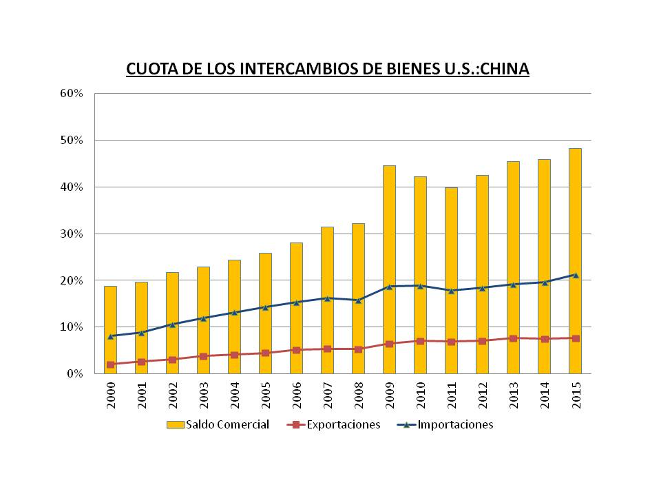 La gráfica anterior muestra como los intercambios comerciales estadounidenses de bienes con China han constituido una parte cada vez más importante de los intercambios comerciales totales estadounidenses. Tanto en exportaciones como importaciones, ya que entre los años 2000 y 2015, la cuota de las exportaciones estadounidenses a China se ha multiplicado por 2,7 llegando al 7,69%, mientras que la cuota de importaciones se ha multiplicado por 1,6 llegando al 21,26%, sin que la evolución de las exportaciones impida que el déficit comercial de bienes con China haya pasado en ese periodo de tiempo de constituir el 18,76% al 48,15%, es decir, actualmente casi la mitad del déficit exterior estadounidense. Déficit es ligeramente paliado por un saldo positivo del intercambio de servicios entre los dos países, que en 2015 dio lugar a un superávit estadounidense de 29.500 mill $, reduciendo el déficit exterior estadounidense con China hasta los 336.200 mill de $.
