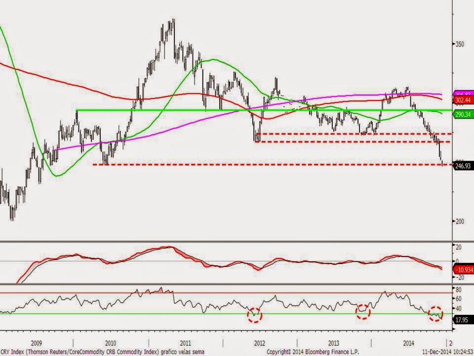 No obstante, tal y como venimos observando, no se pueden deshacer totalmente los riesgos. Insistimos que, desde hace años, los mercados no se rigen por los datos macro o micro, sino por las decisiones de los bancos centrales. Y en cualquier momento, tenemos rumores o decisiones del BCE o de cualquier otro banco central que hace que de repente vuelve el apetito por el riesgo. Actualmente con el claro peligro de deflación que reina en Europa o de baja inflación en Estados Unidos que retrase la subida de tipos de interés, entiendo que los dos activos que debemos vigilar antes de incrementar riesgos en las carteras son los de la evolución del precio del petróleo y de las materias primas en general. De momento ninguno hace amago de rebotar. Necesitamos una figura de suelo o de giro alcista para que se elimine el actual fantasma de la deflación.