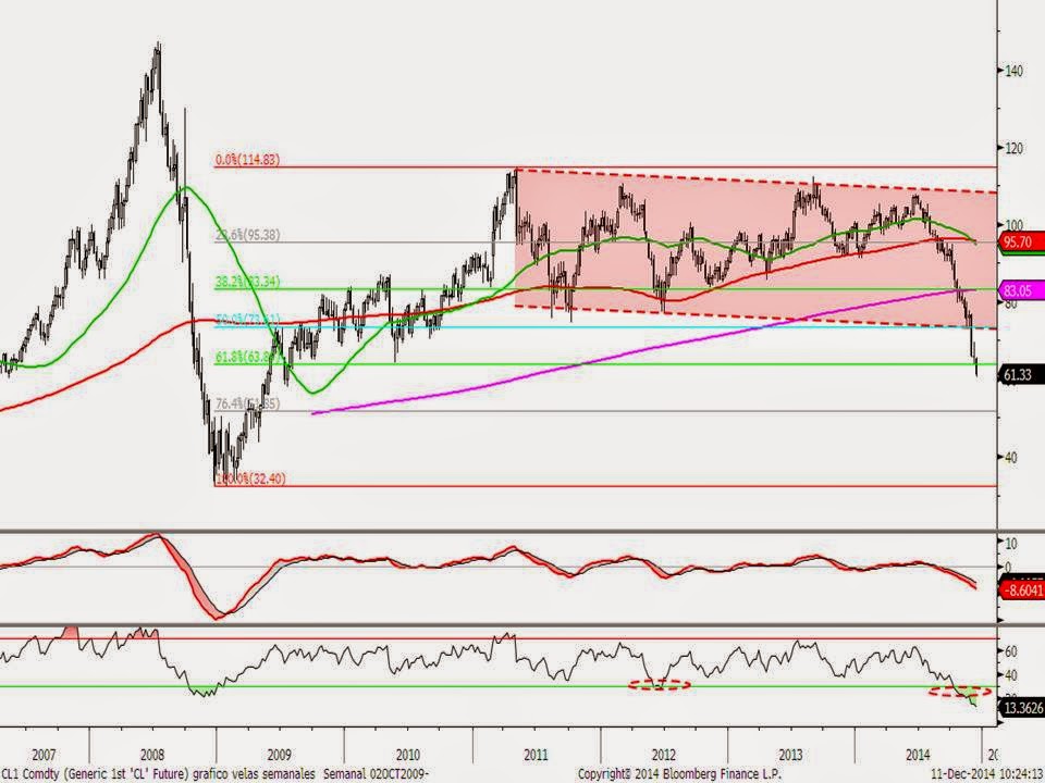 Evolución del futuro del west Texas (crudo). Esta semana está perdiendo los mínimos de 2.010 y último retroceso de Fibonacci de toda la subida desde 2009. Claramente sobrevendido pero tal y como hemos comentado no hay amago de rebote alguno.