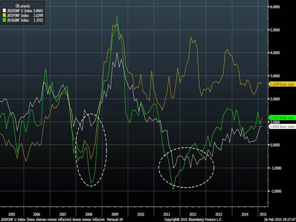 Para Alemania se espera mañana una lectura de -0.5% justo el mismo dato de enero (línea blanca). Para España, el mercado espera una caída de los precios del 1.5% desde la caída del 1.3% de enero (línea amarilla). En todos los casos, según se aprecia en los gráficos, son lecturas similares a las de 2009. Sin duda, tal y como hemos comentado recurrentemente, bajadas de la inflación hacen más atractivos a los bonos. Ayer mismo se produjo la primera subasta de bonos alemanes a 5 años con rentabilidad negativa (-0.08%), y la demanda superó la oferta. Y es que si miramos la evolución de la tir de los bonos a 10 años de los países comentados menos la inflación, observamos que ofrecen rentabilidades atractivas en términos históricos, y serían mayores si las previsiones son correctas y la inflación sigue bajando según las previsiones. Sin duda viendo este gráfico se comprende por qué la tir de los bonos americanos está más alta que las de los bonos europeos.