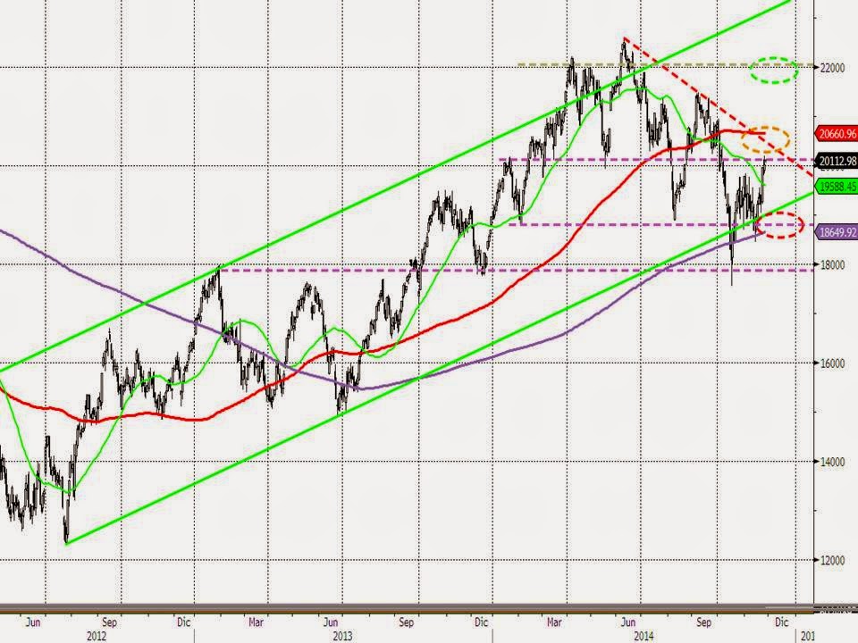 Ayer comentábamos que los mercados de riesgo suben más por el miedo de los inversores a no perderse el posible rally alcista o reacciones a futuras noticias que por una clara convicción de que la situación macro y micro irá a mejor. Hoy vemos que las bolsas continúan la misma tónica. Europa claramente ha superado las resistencias de octubre y primera quincena de noviembre y ahora sus índices principales se deberían mover en un nuevo terreno lateral entre las resistencias superadas y los máximos del año. Veámoslo en gráficos.
