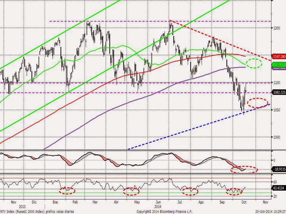 La clave como siempre es poder saber si el rebote iniciado es un simple rebote o el inicio de un nuevo tramo alcista que nos lleve a las bolsas de nuevo a la zona de máximos anuales. Es decir, si estamos ante un mero recorte dentro de la tendencia principal alcista, o ante el inicio de una corrección de mayor calado. La clave será el comportamiento de los principales índices en los niveles de soporte perdidos al inicio de este mes. En este sentido, seguimos escogiendo el gráfico del Russell 2000, que se sigue comportando como indicador adelantado. El viernes lideraba las alzas de los índices norteamericanos cuando al llegar justo al nivel de 1.100 puntos, se giró a la baja y terminó la sesión en negativo (corrigió más de un 1,5% desde los máximos). En el gráfico del Russell 2.000 se aprecia que la zona de 1.100 puntos era la primera resistencia de este índice. Por arriba entendemos que la zona comprendida entre 1.125 y 1.150 (medias de 30, 200 y 500 sesiones) y directriz bajista, es el objetivo máximo del rebote actual. A corto plazo entendemos que este índice se moverá entre 1.050 (mínimos de la semana pasada) y esta zona comentada y los inversores deberían aprovechar estos movimientos para adaptar las carteras al nuevo entorno. Aprovechando los rebotes para reducir riesgos y los recortes para aumentarlos.