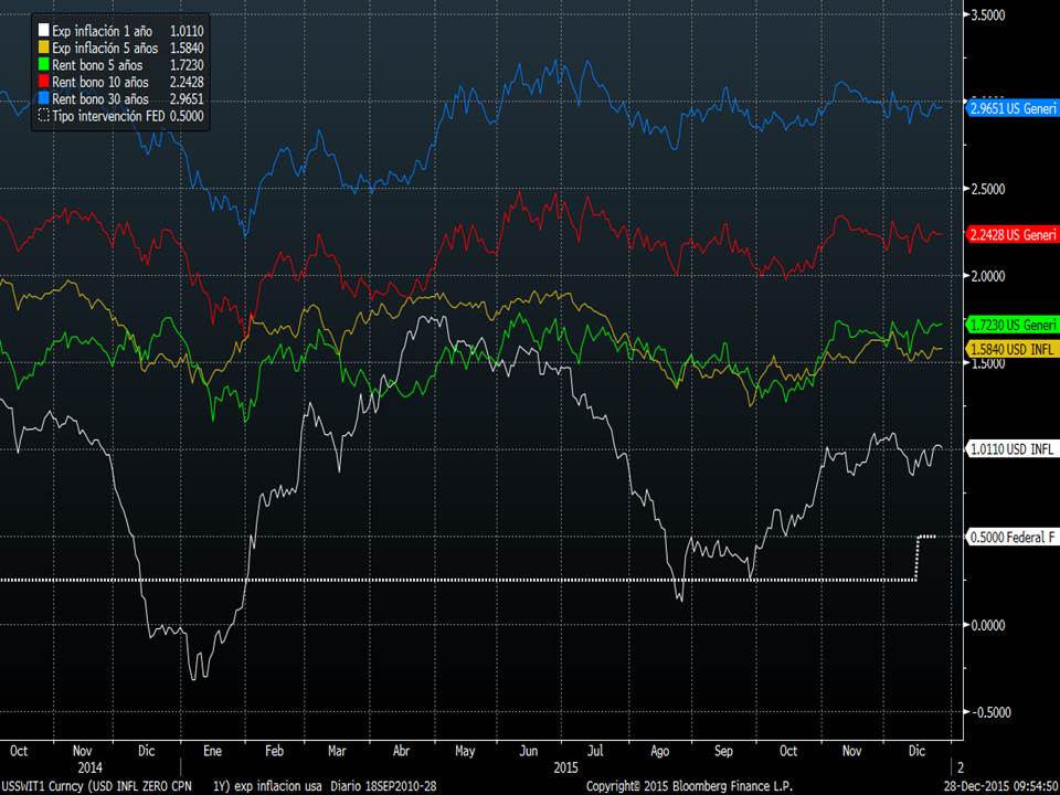 Evidentemente con los precios del petróleo en clara decadencia, arrastrando al resto de materias primas, las expectativas de inflación en Europa vuelven a retroceder en este mes de diciembre. Además, debemos recordar que las medidas tomadas por el BCE se quedaron cortas respecto a lo que estimaba el mercado. Bajada de expectativas de inflación generan un recorrido adicional a los bonos (bajadas de tir; subidas de precio), lo que es negativo para la renta variable. En el siguiente gráfico vemos las expectativas de inflación de la zona euro. Las de más corto plazo han pasado del 0.75% al 0.40% en sólo unas semanas (línea amarilla) y las de más largo plazo han corregido unos 20 p.b. más o menos en todos los plazos.