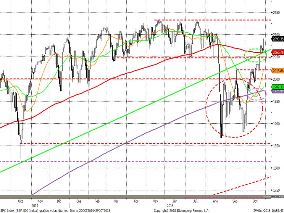 ¿Cómo se lo ha tomado el mercado? Pues la primera reacción fue positiva. El S&P500 cerró en máximos de la sesión y máximos de las últimas semanas, confirmando la ruptura alcista de la media de 200 sesiones y la zona de soportes perdidos este verano (zona entre 2.050 y 2.060). El razonamiento es lógico. Estados Unidos crece a buen ritmo y el ritmo de creación de empleo es el adecuado y la FED es consciente de que no tendrá problemas para que la economía norteamericana logre el objetivo de pleno empleo e inflación.