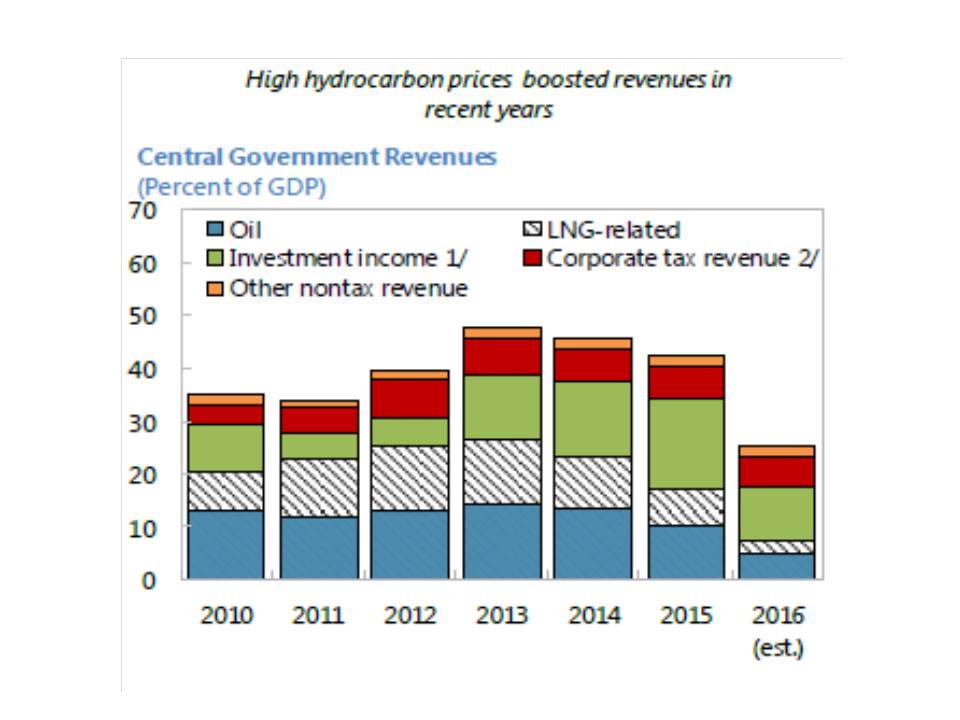 Por tanto, los problemas presupuestarios del país tienen su origen en los menores ingresos procedentes de la explotación de hidrocarburos en sus diferentes formas, que han contribuido a reducir los ingresos del país un 25% en 2015, pasando de un superávit fiscal de un 12,3% del PIB en 2014 a un 1,2% en 2015 y un estimado -0,9% en 2016.