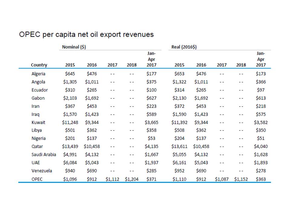 Sin embargo, en términos de ingreso per capita reales por petróleo, los cataríes presentan los mayores ingresos de la OPEP, 4.040 $ frente a los 1.628 de los saudíes, debido a que la población Qatarí es muy inferior a la saudí, suponiendo solo el 7% de esta.