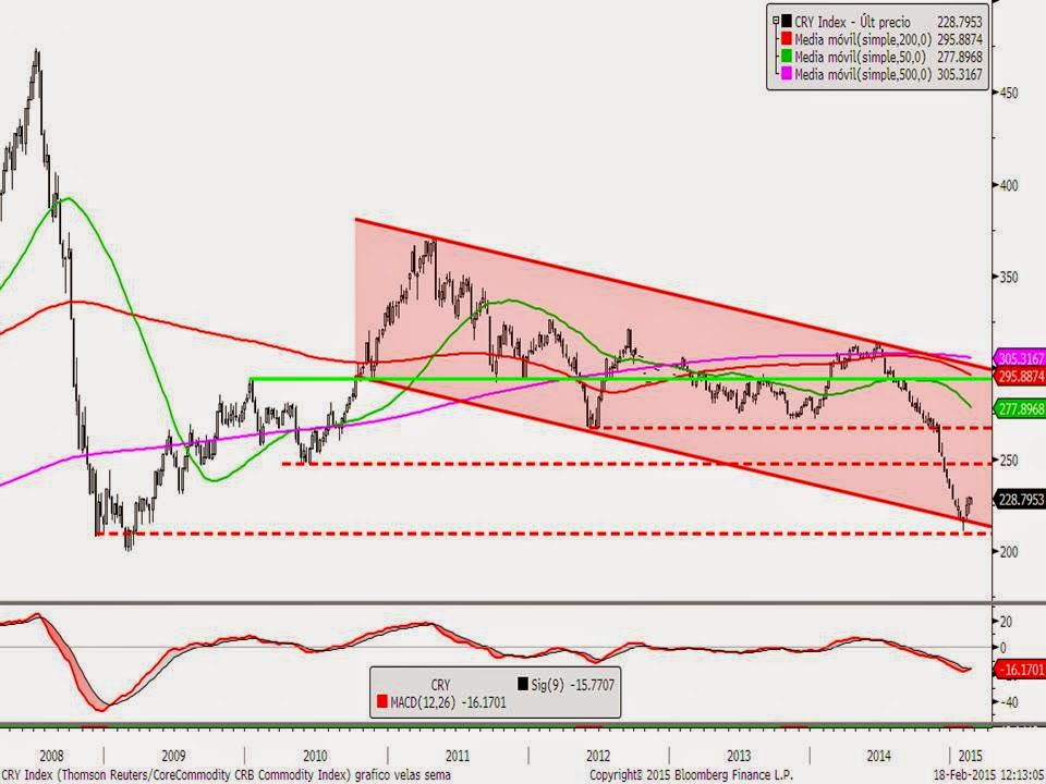 Por supuesto un suelo en el Petróleo da bastante probabilidad a un suelo en el resto de materias primas. El índice CRY de materias primas ha rebotado cerca de los mínimos de 2009 y en la base del canal bajista de los 4 últimos años.