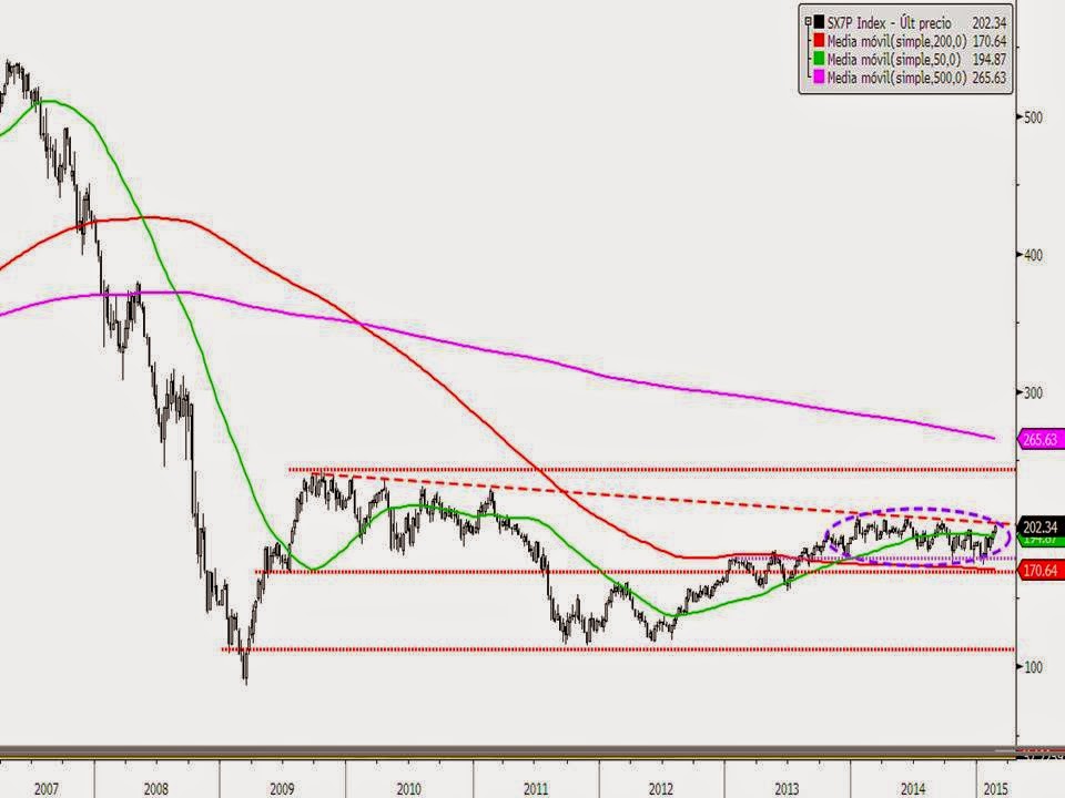 Evolución del Sectorial bancario de la zona euro. La evolución de este índice es la que explica gran parte del comportamiento del Ibex 35 ya que pesa un 40%. Aunque no hay gran novedad desde el punto de vista técnico puesto que sigue en el movimiento lateral en el que lleva inmerso desde el verano del 2013, esta semana está atacando una clara zona de resistencia. Un cierre semanal por encima de 205-210 puntos significaría la ruptura alcista de la línea que une los máximos desde 2009 y podría dar un empujón alcista al sectorial bancario al menos hasta los 250 puntos (línea de máximos de 2009).