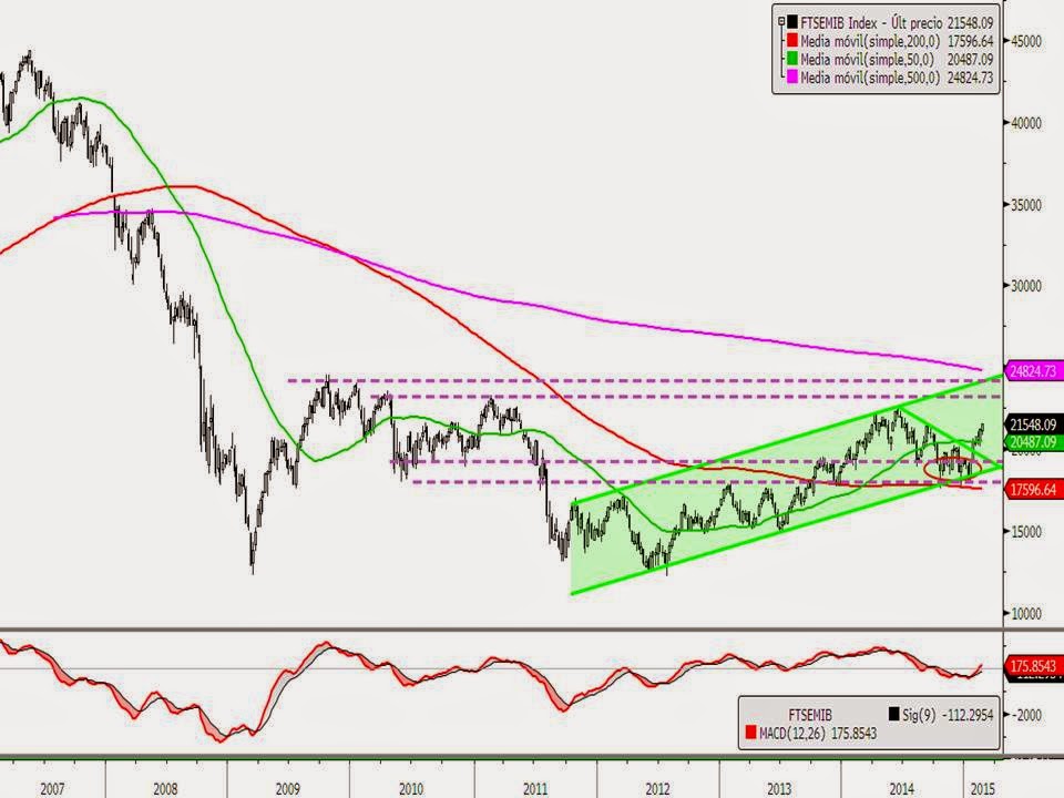 Para confirmar la teoría, el MIB 30 italiano tiene aspecto similar al Ibex 35 y situaríamos objetivo alcista entre 22.500 (máximos del año pasado) y 25.000 puntos (máximos del 2009 y media de 500 sesiones).