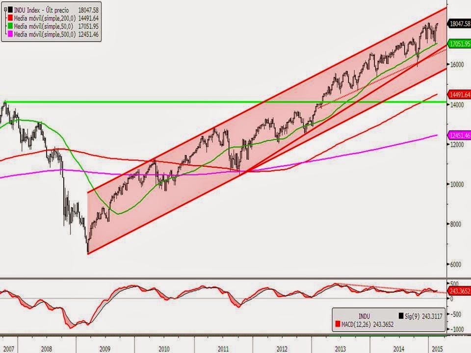 Este era el índice norteamericano que más dudas ofrecía, ya que tanto el Dow Jones industrial como el S&P500 nunca han ofrecido dudas alcistas con sucesión de máximos y mínimos crecientes, según se aprecia en el gráfico del Dow Jones industrial.