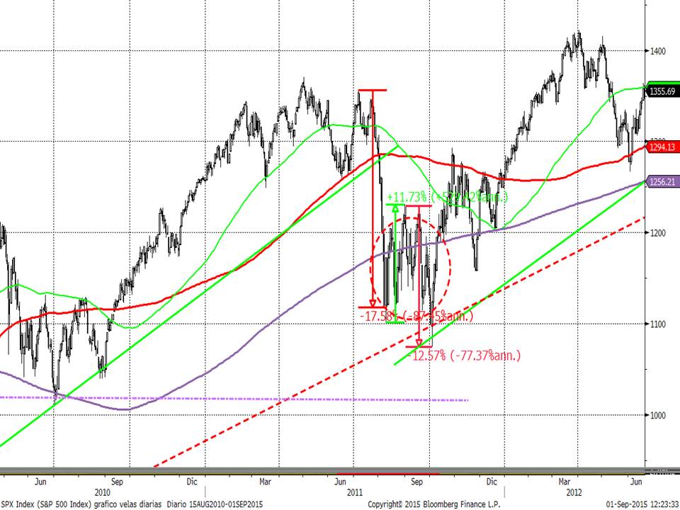 Si ampliamos el movimiento del 2011 del S&P500 vemos que incluso las oscilaciones del precio eran superiores a estas que estamos viendo este año. Tras una corrección de un 17.5 en sólo unas sesiones, el S&P500 estuvo desde principios de agosto hasta final de septiembre moviéndose en un rango de un 12% arriba o abajo con grandes cambios de tendencia de unos días a otros, fruto de los nervios del momento. Y no fue hasta inicio del año siguiente que no se recuperaron los niveles perdidos en agosto.