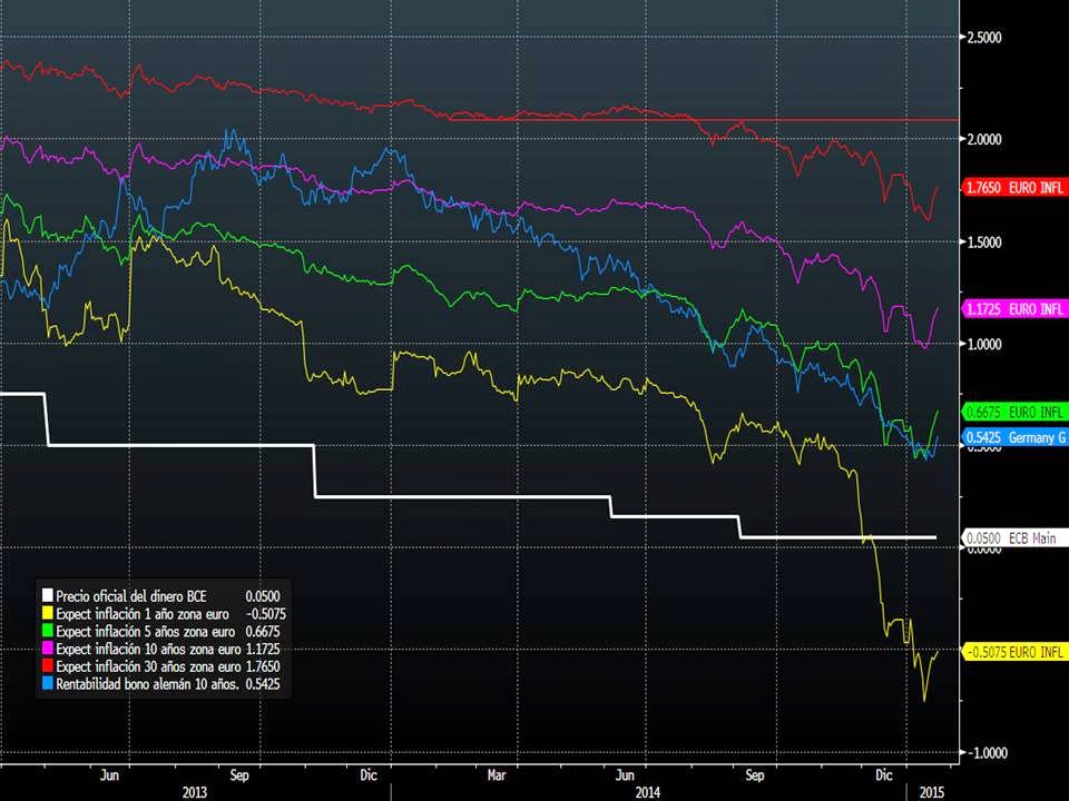 Así pues, el descuento del anuncio del QE por el BCE al menos ha servido para que repunten en Europa las expectativas de inflación según se aprecia en el gráfico que venimos adjuntando desde hace meses. Quiero destacar la línea verde (expectativas inflación a cinco años) y la azul (tir del bono alemán a 10 años). Las expectativas encadenan 7 sesiones de subidas (las mismas que la renta variable europea) y quizás esto explique la subida de la tir del bono alemán de 10 p.b. desde ayer por la mañana (del 0.44% al 0.54%)