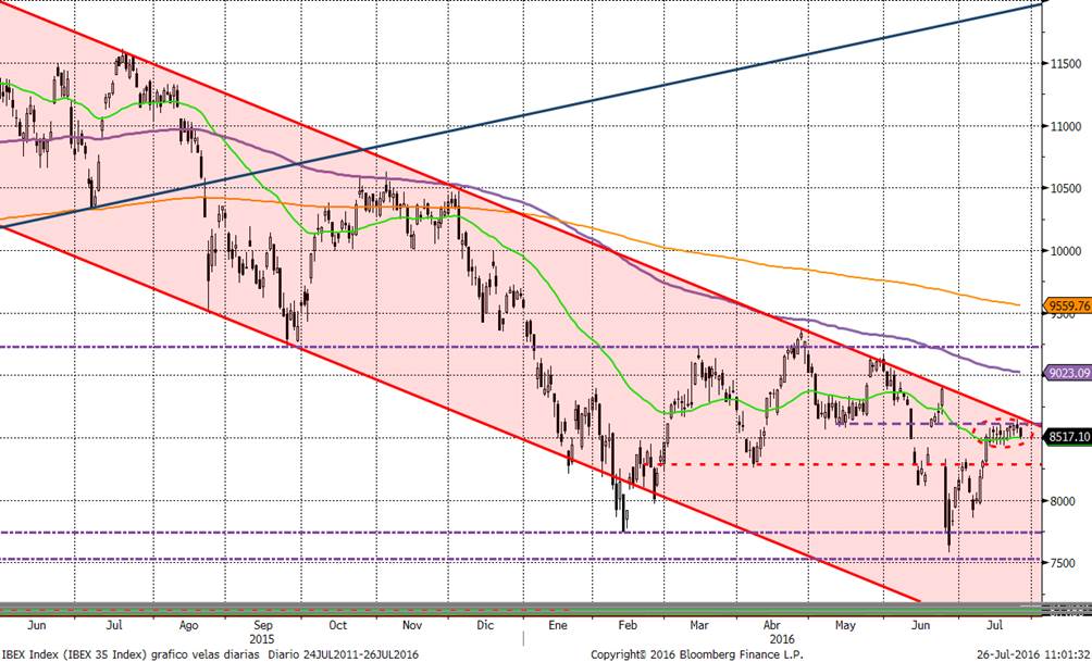 En cuanto a las bolsas europeas, destacar que a pesar de los recortes del día de hoy, todas se mantienen en un lateral muy estrecho que ya dura 10 sesiones justo al borde de resistencias. El gráfico que mejor refleja la situación es el del Ibex 35. El lateral comentado está entre 8.425 y 8.640 puntos. Por arriba tenemos la línea que une los máximos desde julio del año pasado, y por abajo la media de 50 sesiones.