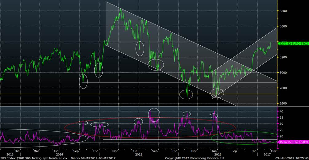 En el gráfico podemos ver la relación inversa que existe entre la evolución del ITRAXX y de los mercados de renta variable. Hubo fuertes repuntes el año pasado hasta febrero cuando las bolsas caían en picado y también se produjo en la semana del Brexit y los días previos a las elecciones de Estados Unidos. Sin embargo en diciembre, al igual que las bolsas europeas rompieron al alza, el Itraxx Crossover rompió a la baja la directriz alcista (bajista en bolsa) iniciada en 2014. Y esta semana, al igual que el Eurostoxx rompió al alza, el Itraxx rompió a la baja claramente la línea de mínimos del año.