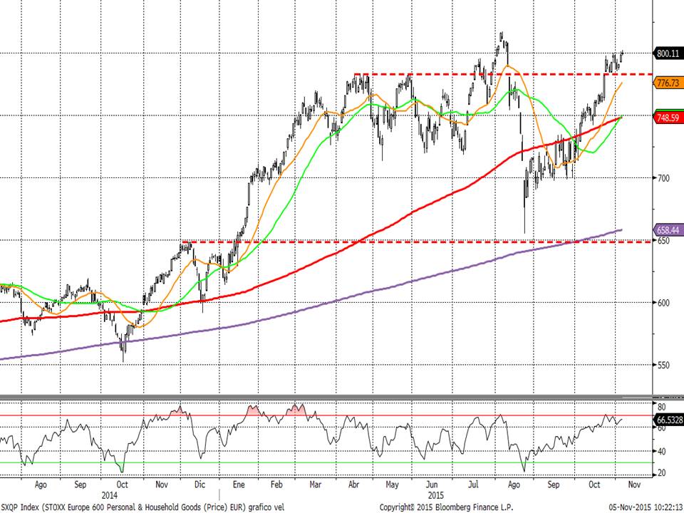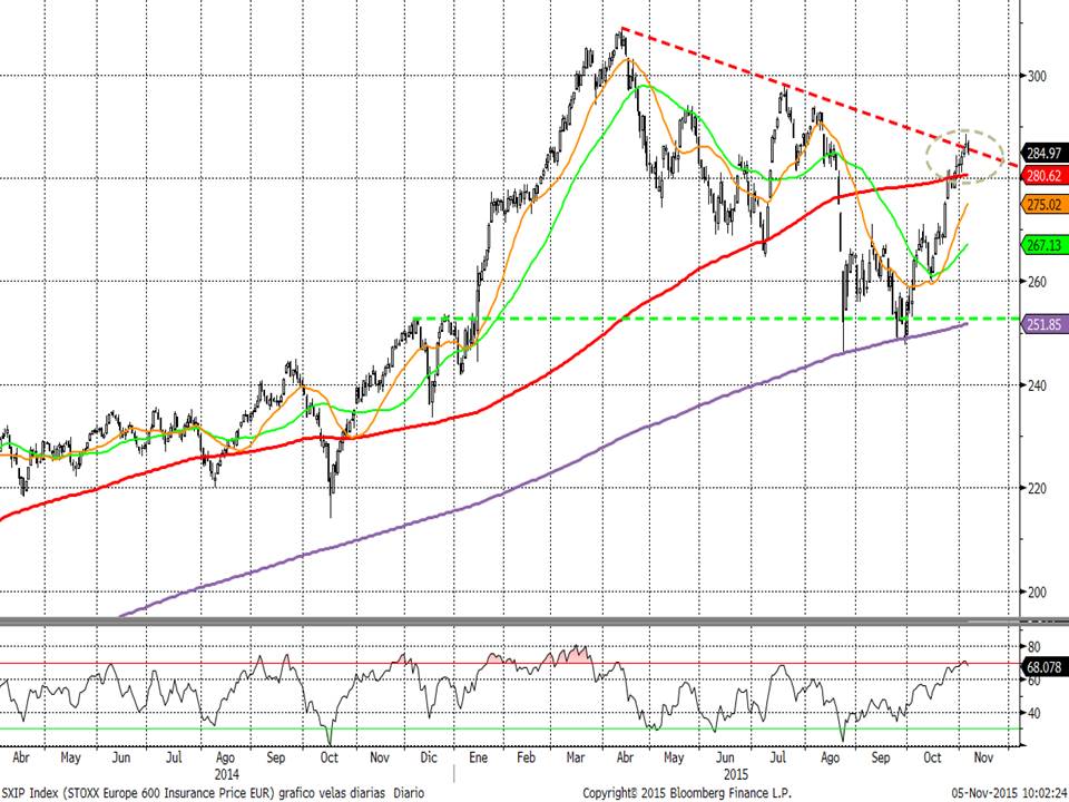 Viendo el conjunto de los sectores, está claro que la media de 200 sesiones, unido a la subida vertical de las últimas semanas, va a dificultar que sigamos subiendo en las próximas sesiones con la misma fuerza del mes de octubre. Así pues, los inversores que operan en plazos más cortos pueden aprovechar estas subidas para reducir riesgos con la firme idea de volver a incrementarlos en cuanto superemos la media de 200 sesiones. Y a los inversores que operan a más largo plazo, entiendo que no merece la pena reducirlos, puesto que estamos hablando de la posibilidad de ver un recorte en las bolsas de un 2% al 4%, frente a la posibilidad de seguir subiendo hasta máximos anuales. Para este tipo de inversores sólo habría que reducir riesgos si volvemos a máximos del año o si los principales índices vuelven a perforar a la baja la zona de máximos de septiembre que se ha recuperado en octubre (zona de 2.050 del S&P500 y 360 del Eurostoxx 600).
