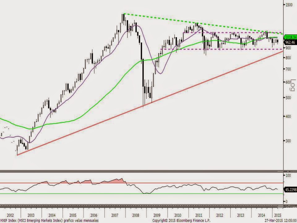 Y si el MSCI World lleva un año consolidando los niveles de la subida, tenemos a los mercados emergentes en un claro movimiento lateral que dura más de cinco años entre 900 y 1.100 puntos. Desde el punto de vista técnico generará un importante tramo al alza si supera el 1.100 o a la baja si pierde la zona de 900 puntos.