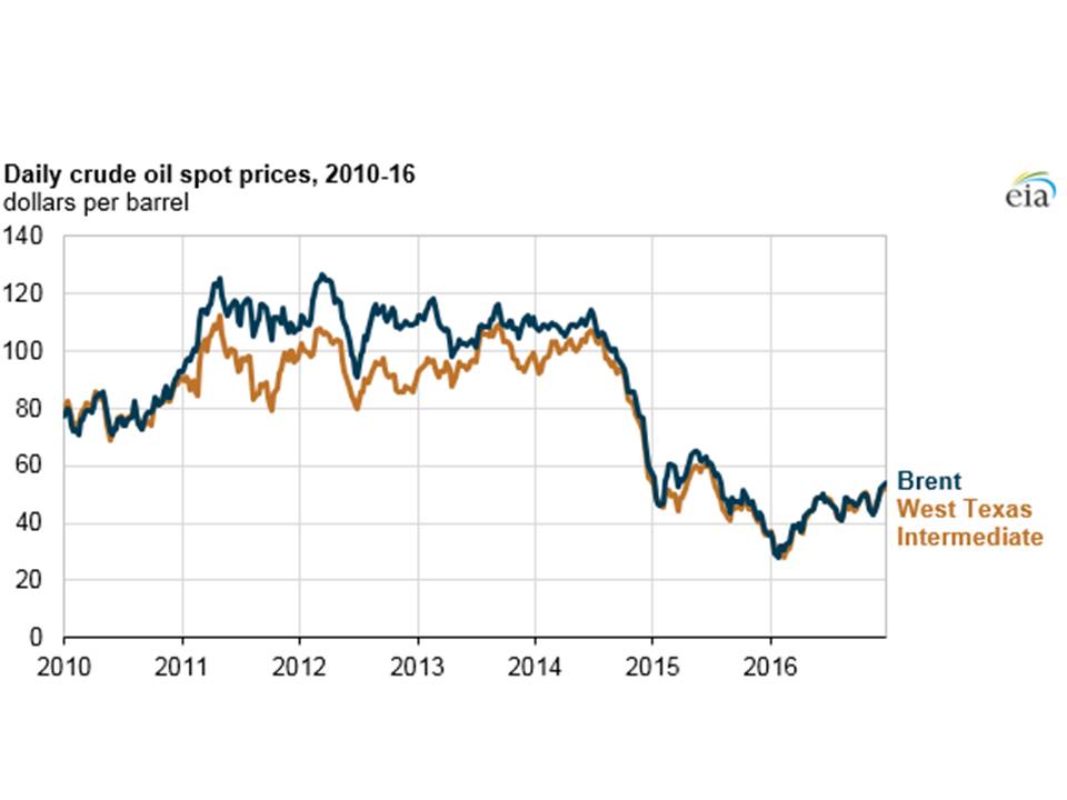 Figura: Crude oil prices increased in 2016 still below 2015 averages (EIA)
