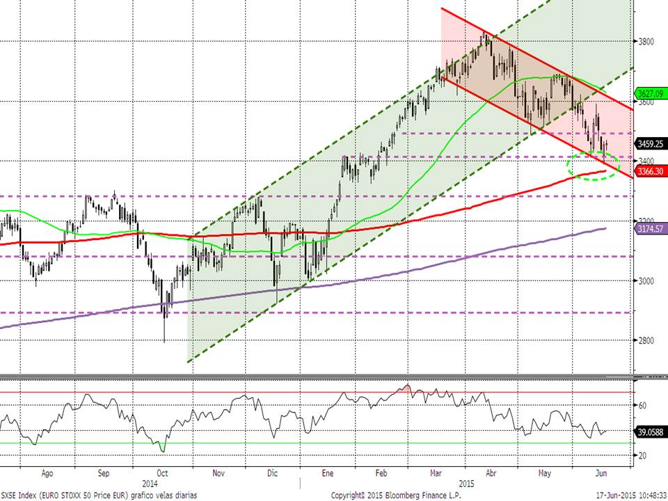 Así pues, si tras la reunión de mañana, desaparecen incertidumbres, evidentemente bajará la volatilidad implícita, y por tanto tendremos asegurado un giro alcista del Eurostoxx 50. La zona desde el punto de vista técnico no es mala para intentar un rebote. Desde hace varias semanas (aunque a largo plazo hemos insistido en el 3.300 o 3.100 como zonas de soporte), hemos visto el nivel de 3.400 como el soporte de corto plazo que no podría descartarse. Ayer vimos de nuevo cómo el 3.400, tras perderlo en el intradía, lo recuperó con creces. Además la zona de 3.366 (media de 200 sesiones) puede funcionar como soporte de medio plazo.