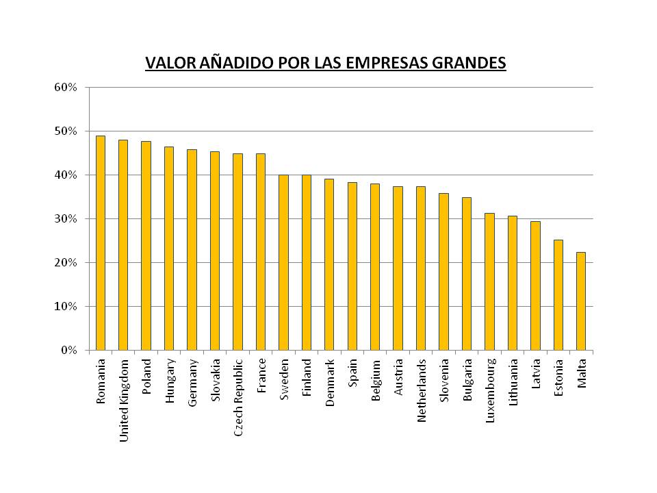 Los datos avalan esta afirmación, ya que el valor añadido (VA) aportado por las empresas grandes supone, en función de los países, entre el 48,89% (Rumanía) y el 22,47% (Malta) del VA total (figura siguiente) , cuando solo suponen el 0,19% del tejido empresarial de la UE-28 . Aportando en España este tipo de empresas el 38,26% del VA total, un porcentaje ligeramente inferior al de la media de los países estudiados de la UE-28 (38,73%).