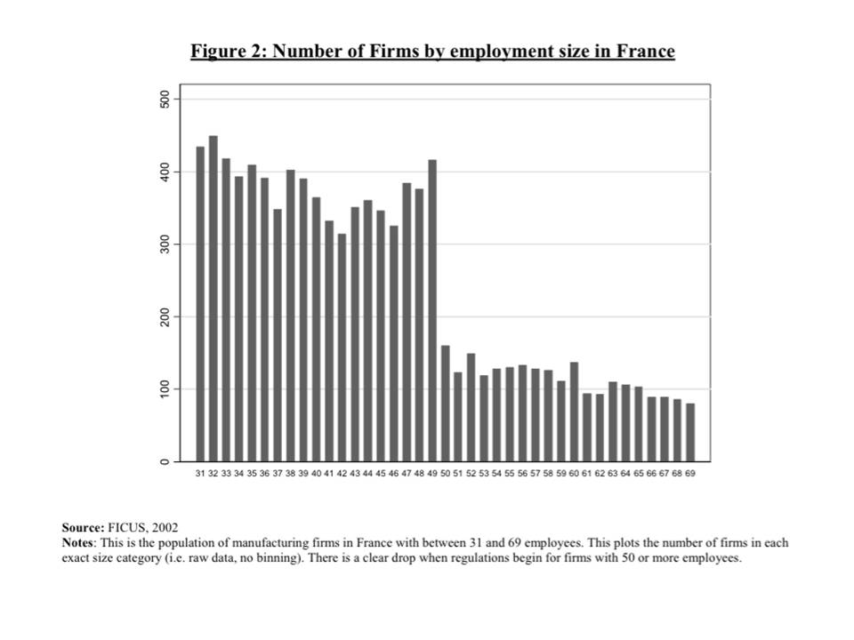 Entre los problemas que son origen de la elevada proporción de empresas pequeñas se encuentran las trabas impuestas a su crecimiento, destacando la regulación, tal como indica Samuel Bentolillanos enfrentamos con distintos problemas, entre ellos la “maldición del empleado 50”, ya que al superar el empleado 50, la empresa incrementa su carga administrativa, necesita un comité de empresa, desembolsar el IVA con una frecuencia mensual, mayores importes de los pagos fraccionarios del impuesto de sociedades y no poder hacer cuentas abreviadas o tener que emplear a un auditor de cuentas, lo que se refleja en una tendencia a no pasar dicho umbral, tal como se muestra en la gráfica siguiente para el sector manufacturero francés, con problemática semejante.