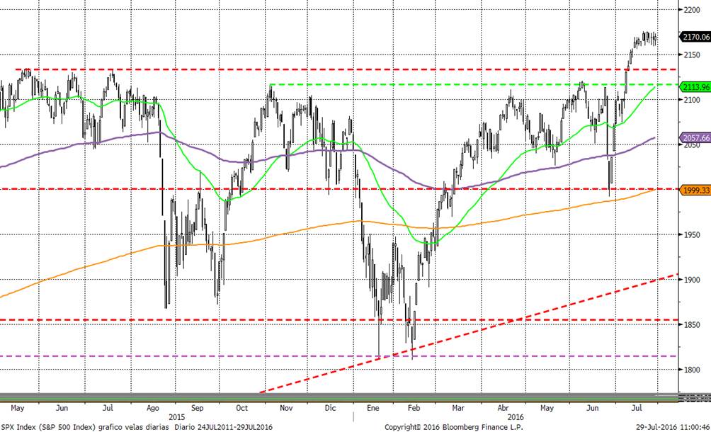 Pero el lateral no es algo específico de las bolsas europeas. El S&P500, tras romper a principios de mes los máximos de 2015, lleva también 12 sesiones moviéndose entre 2.158 y 2.175 puntos. Este índice seguirá siendo claramente alcista y apoyará al resto de bolsas mundiales mientras no pierda la zona de resistencias superadas (2.115-2.130 puntos).