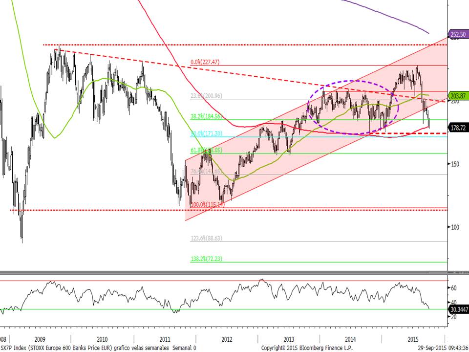 Y por último tenemos al sector bancario. Es caso aparte. Cotiza por debajo de los mínimos de agosto, pero está justo en la media de 200 semanas y cerca de los mínimos de final del año pasado y principios de este año. Así que es otro sector en soporte aunque no presente gran potencial desde el punto de vista fundamental.