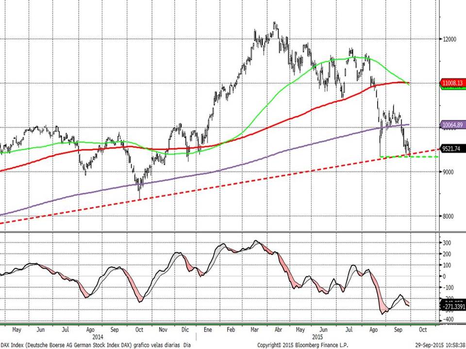 De momento no está ocurriendo y hoy, a pesar de las debacle del Nikkei, las bolsas europeas se han girado al alza justo al acercarse a los mínimos intradía marcados el pasado 24 de agosto. El DAX, que es el índice más afectado estos días tras la debacle del sector autos, hoy se ha parado justo en los mínimos de ese día y está rebotando con fuerza recuperando un 2%. No sabemos si es porque se están saliendo los cortos o porque los inversores apuestan por el rebote, pero el caso es que los soportes están funcionando.