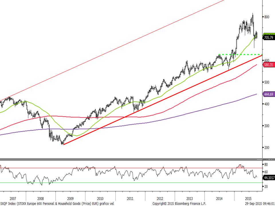 Normalmente cuando estamos ante la posibilidad de un techo o suelo de mercado suelo echar un vistazo a la situación de los sectoriales. Es verdad que si miramos valores o sectores de forma individual tenemos la sensación de que la bolsa está mucho más baja que en agosto. Y es que hay determinados sectores que han seguido cayendo en picado mientras otros aún están lejos de los mínimos de agosto. Evidentemente los que han seguido corrigiendo a plomo son los relacionados con la explotación de materias primas, y esta última semana se ha unido el sector de autos. Pero mirándolos todos en su conjunto tenemos en general a los sectores bajistas en zonas de suelo y los alcistas siguen siéndolo o están también en zonas claras de soporte.
