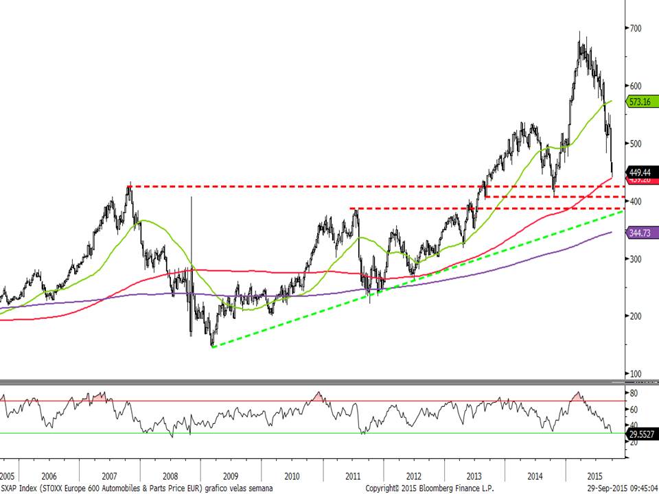 Eurostoxx 600 sector autos. Uno de los sectores alcistas que ha perdido con claridad los mínimos de agosto. Las razones son obvias por el contagio de Volskwagen. Sería un sector a evitar, y puede que siga corrigiendo hasta la zona de 400 puntos tal y cómo se aprecia en el gráfico. Es un sector con un enorme potencial de crecimiento y en cuanto se depuren responsabilidades y se aclare el panorama, será uno de los que lidere las alzas (hablo del sector y no de valores en concreto).