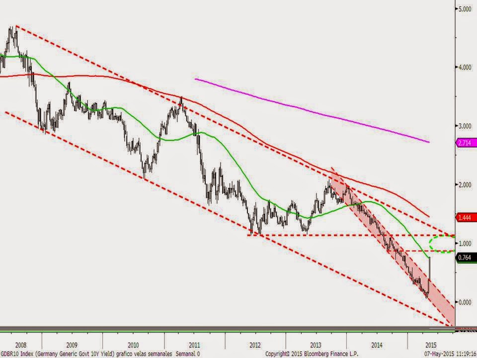 En la renta fija pasa algo muy similar. Está claro que hay más vendedores que compradores y los motivos son exactamente los mismos que para la renta variable. Si vemos el bono alemán, observamos que a pesar del repunte de los tipos de interés más vertical que nunca desde el inicio de la crisis, seguimos en una tendencia bajista de largo plazo. La tir del bono a 10 años puede irse perfectamente a la zona del 1%-1.15% y seguiría siendo bajista. Pero sabiendo que el BCE seguirá comprando bonos por importe de 60.000 millones de euros hasta septiembre del 2016, lo más probable es que vuelvan las compras en los niveles comentados.