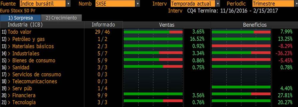 Esta semana viene cargada de publicación de los resultados empresariales del cuarto trimestre. No es la última pero sí que, cuando termine, la mayoría de compañías del Eurostoxx 50 ya habrán publicado los resultados. De entre las muchas compañías queda por publicar esta semana (contando las de hoy) Iberdrola, Aena, A3Media, Dia, Endesa, Gamesa, Indra, REE, Repsol, Telefónica, Mediaset, Amadeus, Caf, IAG en España. En Europa quedan Eiffage, Bayer, Fresenius, Airbus, Axa, Saint Gobain, Sipen, Orange, Veolia, Henkel, Vivendi, Peogeot, Barclays, Safran, Solvay, Basf, RBS entre otras.