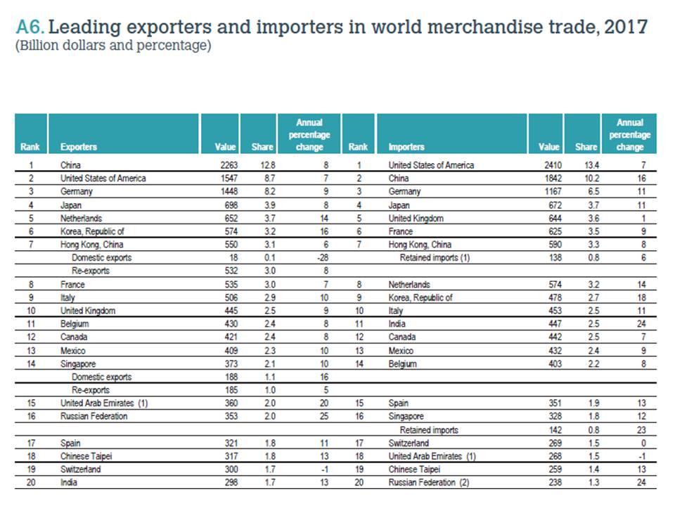 US y China suponen el 40% del PIB mundial y son grandes potencias comerciales , siendo U.S. el mayor importador mundial de bienes y China el mayor exportador mundial (tabla siguiente) , motivo por el que el resultado de las negociaciones afectarán al crecimiento global.