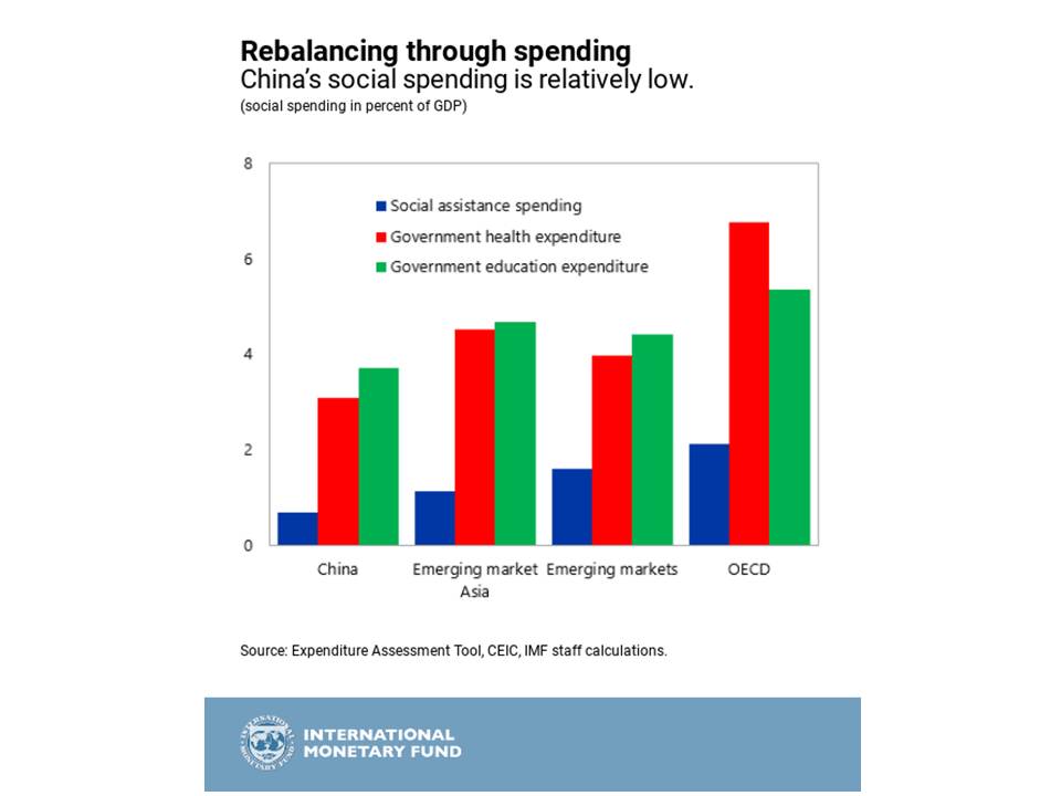 Se trataría de impulsar la demanda doméstica, anormalmente reducida en términos de porcentaje de PIB, como consecuencia de distintas políticas llevadas a cabo anteriormente, como la del hijo único; el sistema hukou; y un relativamente reducido gasto social (figura siguiente), que anima más al ahorro que al consumo con el objeto de prever posibles contingencias.