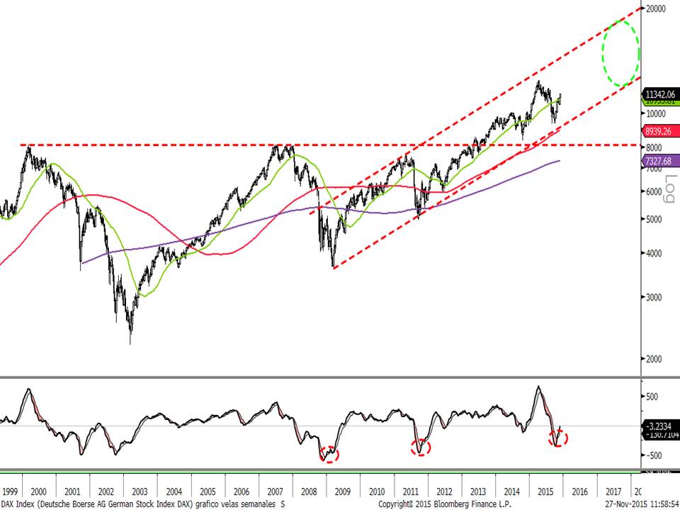 El índice más fuerte en Europa sigue siendo el DAX. Este ya superó en 2013 los máximos del año 2000 y 2007, y es por eso por lo que entendemos que el Eurostoxx 600 puede seguir el mismo camino. El DAX también se mueve en un claro canal alcista desde 2009 y su proyección a dos años vista nos da un rango entre 13.000 y 18.000 puntos.