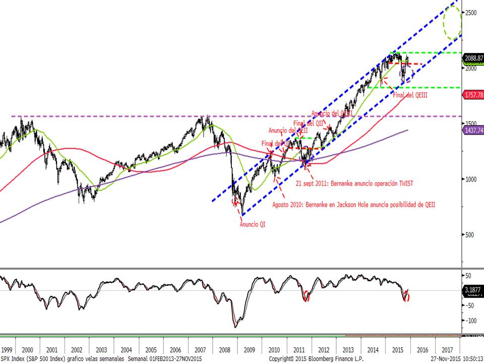 Fuera de Europa tenemos al S&P500 que mantiene a la perfección el canal alcista desde 2009. La proyección a dos años de este canal alcista nos daría un rango para el S&P500 entre 2.300 y 2.600 puntos (+10% y +25%).