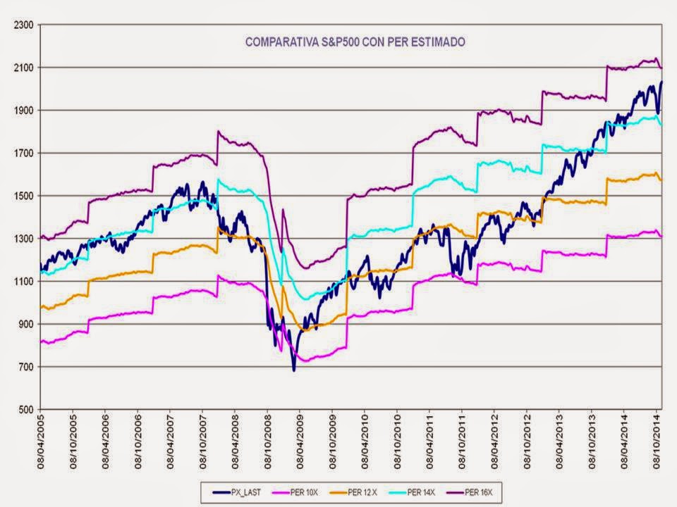 El mismo ejercicio del Eurostoxx, lo he realizado con la cotización del S&P500 teniendo en cuenta que las compañías Growth tienen más peso que las value e históricamente el S&P500 cotiza a per estimado más altos que el Eurostoxx 50. Vemos que el S&P500 cotiza en niveles caros. De momento, desde el verano del 2013 las revisiones al alza de los beneficios están justificando las cotizaciones. Vemos en el último tramo que ya los beneficios por acción se están revisando tímidamente a la baja por lo que “encarece” el índice.