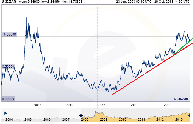 USD/ZAR Creo que a los metales y monedas commodities les espera una bajada en el... J J J J 29 de octubre, 2013