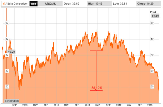 El precio de ABX ha caído desde $43 sin correcciones importantes. Esta por tocar su soporte en $17 y no creo que lo rompa al primer intento.Se viene un anuncio de resultados el próximo miércoles. Dudo que que el anuncio decepcione al mercado, dado que el sentimiento debe estar ya muy negativo por la bajada del precio la acción.Abrir posiciones de aparecer una vela Heiken Ashi 4h verde o de acercase a $ 17.2-17.5Stop: Un cierre diario por debajo de $ 17Objetivo: No se. Probablemente algo ente $ 20-25