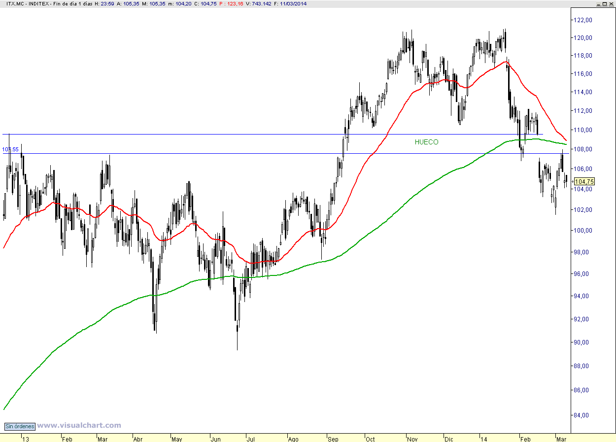 Inditex lleva muchos meses sumido en una tendencia alcista sin contemplaciones, pero todo tiene un límite... ¿hemos llegado ya a ese punto? La respuesta sincera siempre tiene que ser: "No lo sé" pero hay indicios que nos invitan a abrir cortos a la espera de ver al valor un poco más abajo.El hueco dejado en el valor entre 107.60 y 109.60 nos deja unos niveles muy interersantes para poder operar a la baja. Ahora mismo, para operaciones muy especulativas, se podrían abrir cortos a la espera de ver movimientos a la baja que pudiesen acercar el precio a 95€.Pero si lo que buscamos es un gran recorrido, una corrección a todo el tramo alcista que lleva años dibujándose, ahora podría ser una oportunidad, colocando un stop por encima de 110€, podríamos vendernos para buscar el 50% de Fibonnacci (que estaría en los entornos de 70€) donde además tenemos un importante hueco de escape alcista que nos dejó el valor a mediados de junio de 2.012.No sé si veremos a Inditex cotizar a esos múltiplos, pero ahora mismo apostar a eso con el stop ajustado, no me parece ninguna locura.
